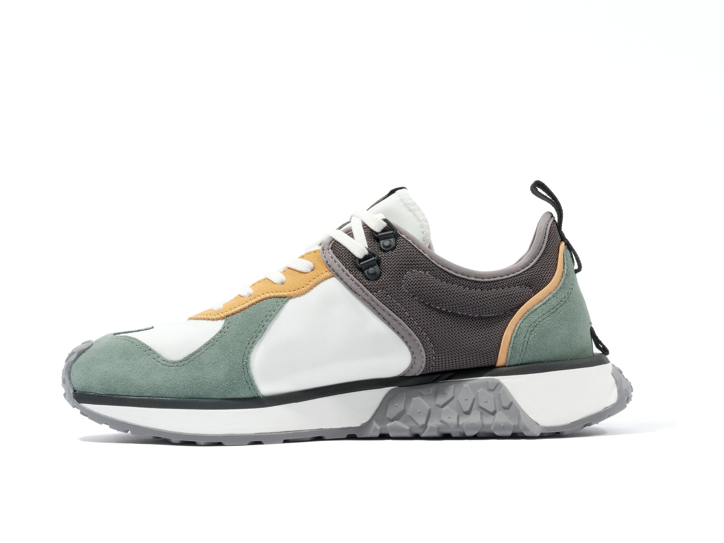 Kick up a storm in this colorful. edgy low top sneaker made from a blend of materials for optimum style and comfort. Its recycled honeycomb lining will allow your feet to breathe while the nylon and suede leather keep you snug and comfortable. Inspired by army trainers and with speed hooks for quick lacing. it has a striking rubber sole that climbs up the sides of the upper for an eye-catchingly bold look.