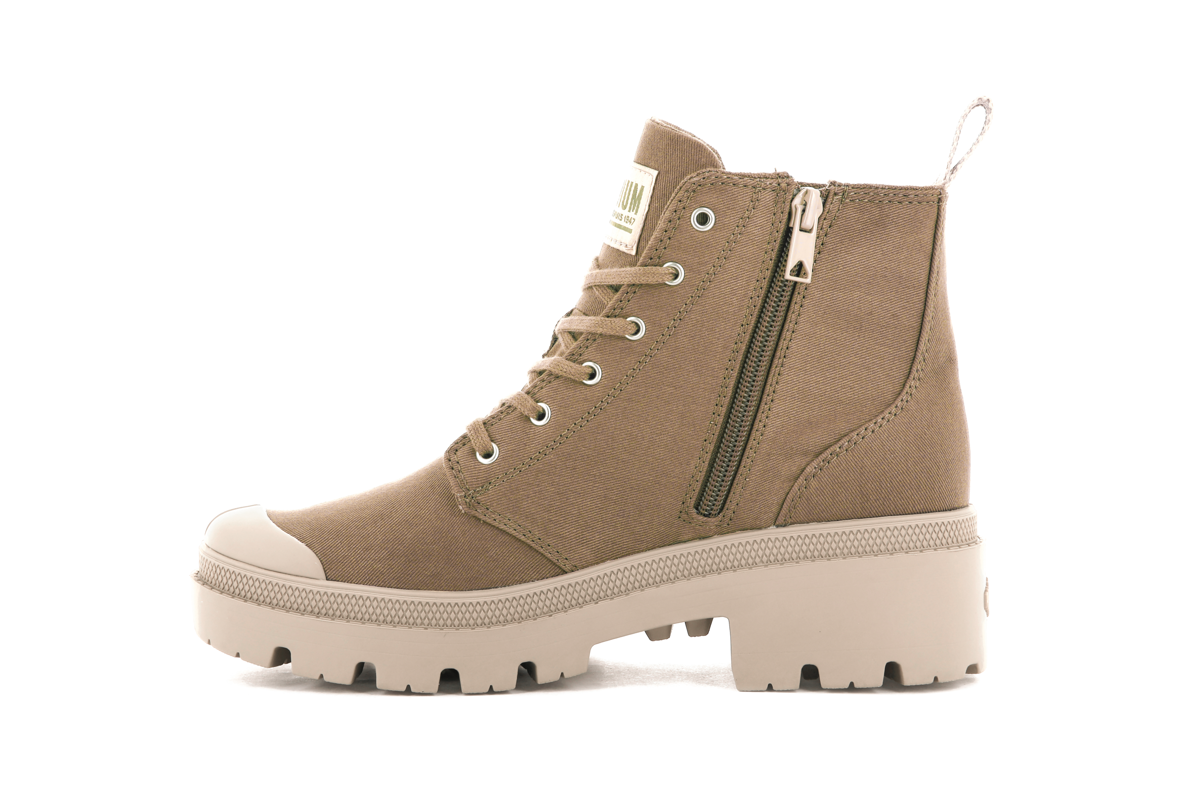 An elevated conscience stays above the noise. That’s the feeling being the Pallabase Twill. a higher level of feminine sophistication in a package that is clearly Palladium. The heel counter of the chunky outsole has been made higher for a lifted look. and the durable twill upper has a discrete side zip entry. A refined boot for those who take the high road.